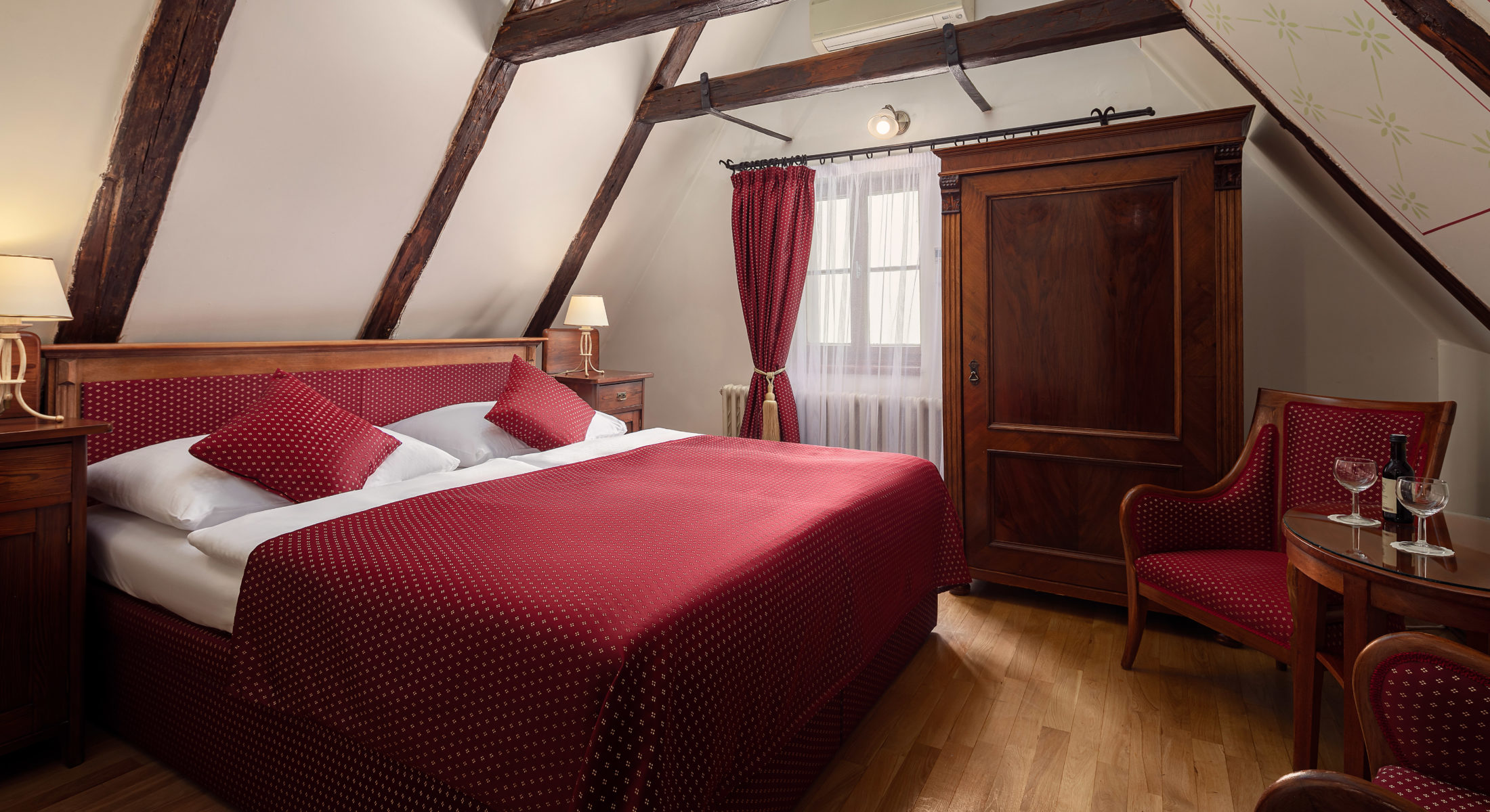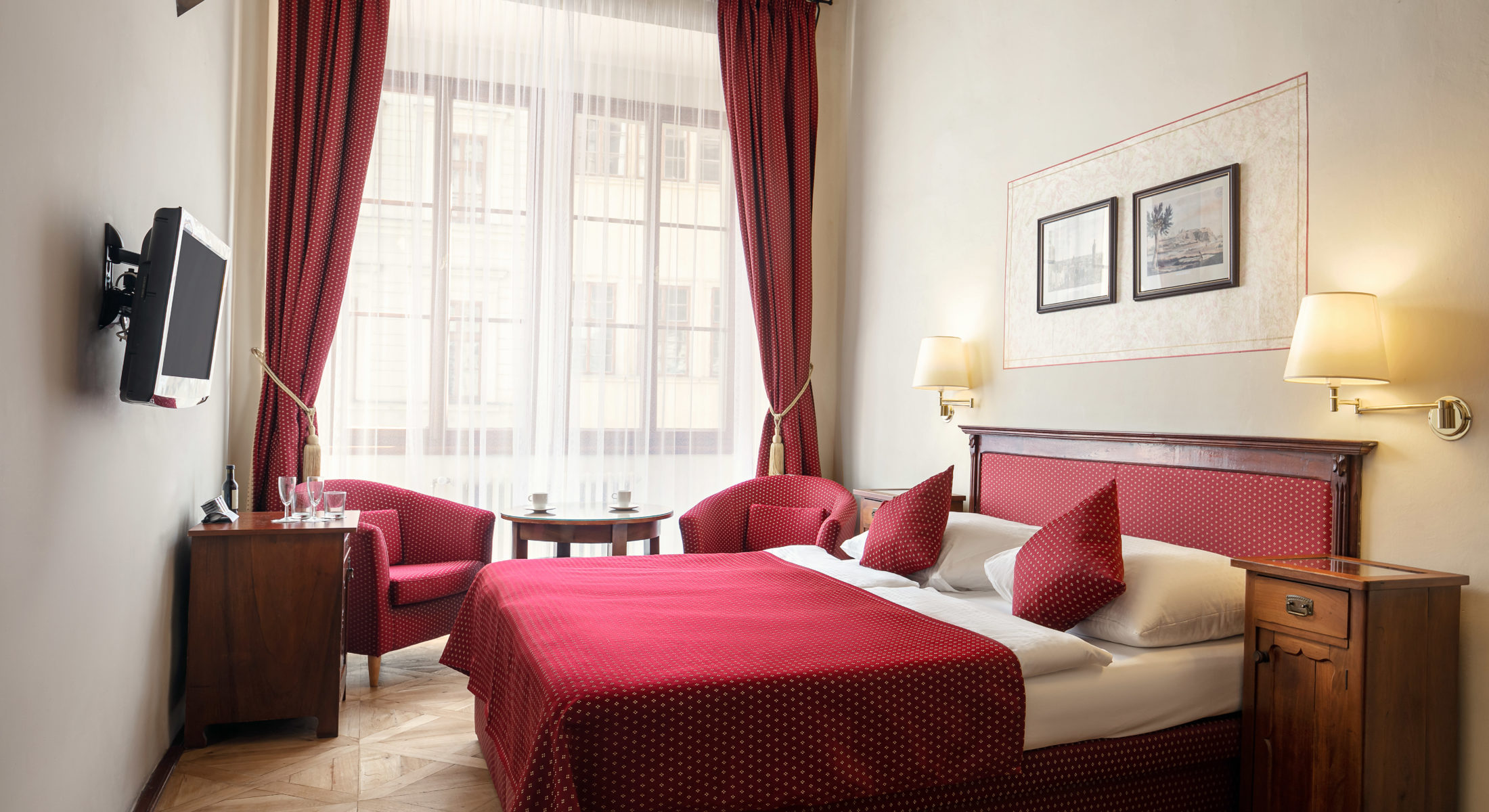 Гостевые комнаты в Пражском Отеле Карл обставлены мебелью в стиле Барокко и реставрированы панельными потолочными балками. Потолок между балками разрисован детально продуманными картинами с лиственным орнаментом, взирающими свысока на гостей, отдыхающих в своих роскошных кроватях.